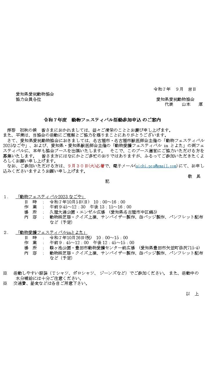 ご参加頂けるみなさまは、お手数をお掛けしますが、愛知県愛玩動物協会までメールにてお知らせ下さい。