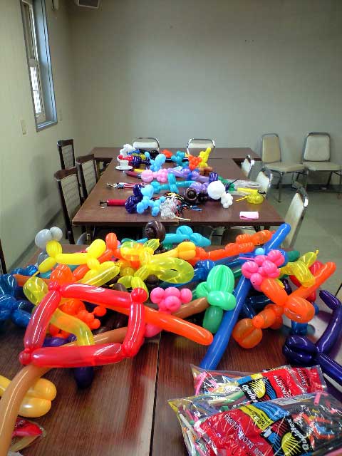 会員でバルーンアート をし、好きな作品をさしあげて子供さんから お年寄りまで喜んでいただいた。 |